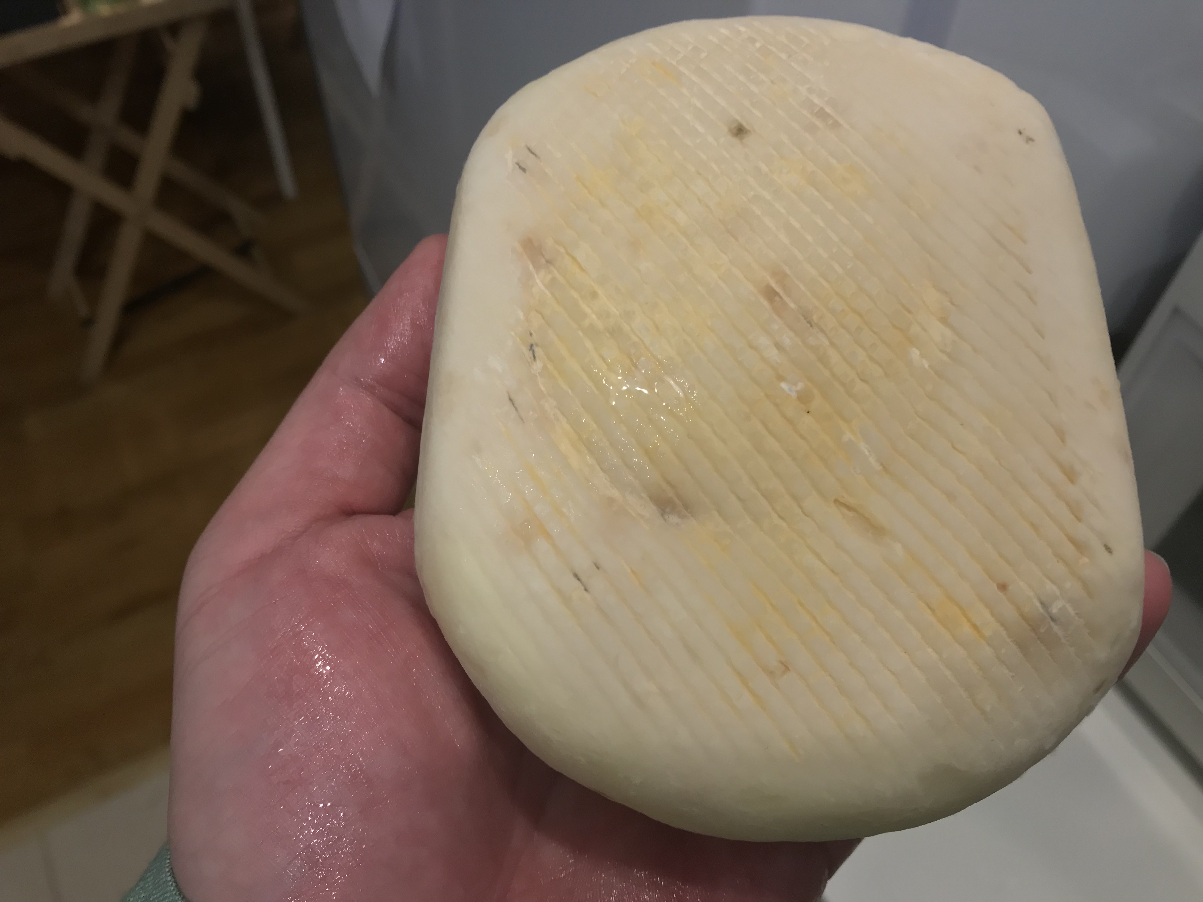 Сделал качотту из коровьего и козьего. Возраст 24 дня. Долго не оьразовывалась корочка. Думаю из-за влажности в холодильнике. Храню на дренажном коврике в закрытом контейнере. Выгуливаю каждый день. Для образования корочки оставил по совету откоытым у балконной двери. Смущает меня цветовая гамма толи плесени толи корочки. Бывалые гляньте плз. Спасибо