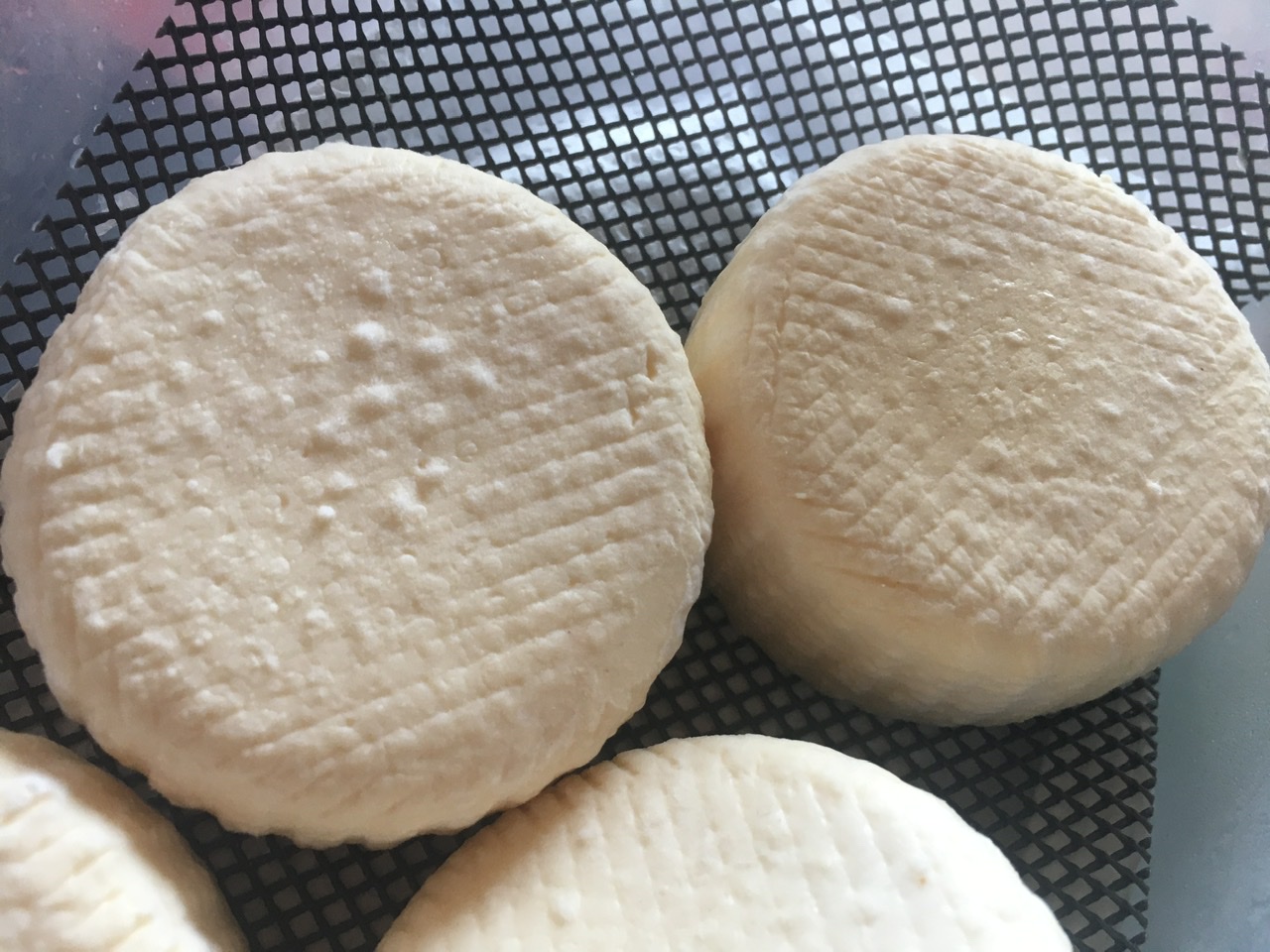 Готовила Камамбер по рецепту с данного сайта, грамовки точно как в рецепте, Молоко пастеризовала, закваска Биоантибут. Просушка была долгой, стекало много сыворотки, пока головки полностью высохли прошло 2 дня. После положила несколько головок в герметичный контейнер, а 1 головку просто на полку в холодильник. Все первую неделю переворачивала 2 раза в день. 22 июня положила в холодильник при температуре 8 градусов. Сегодня 6 июля, т.е. прошло ровно 2 недели, но плесени на нем почти нет. Так, пару маленьких кружочков.