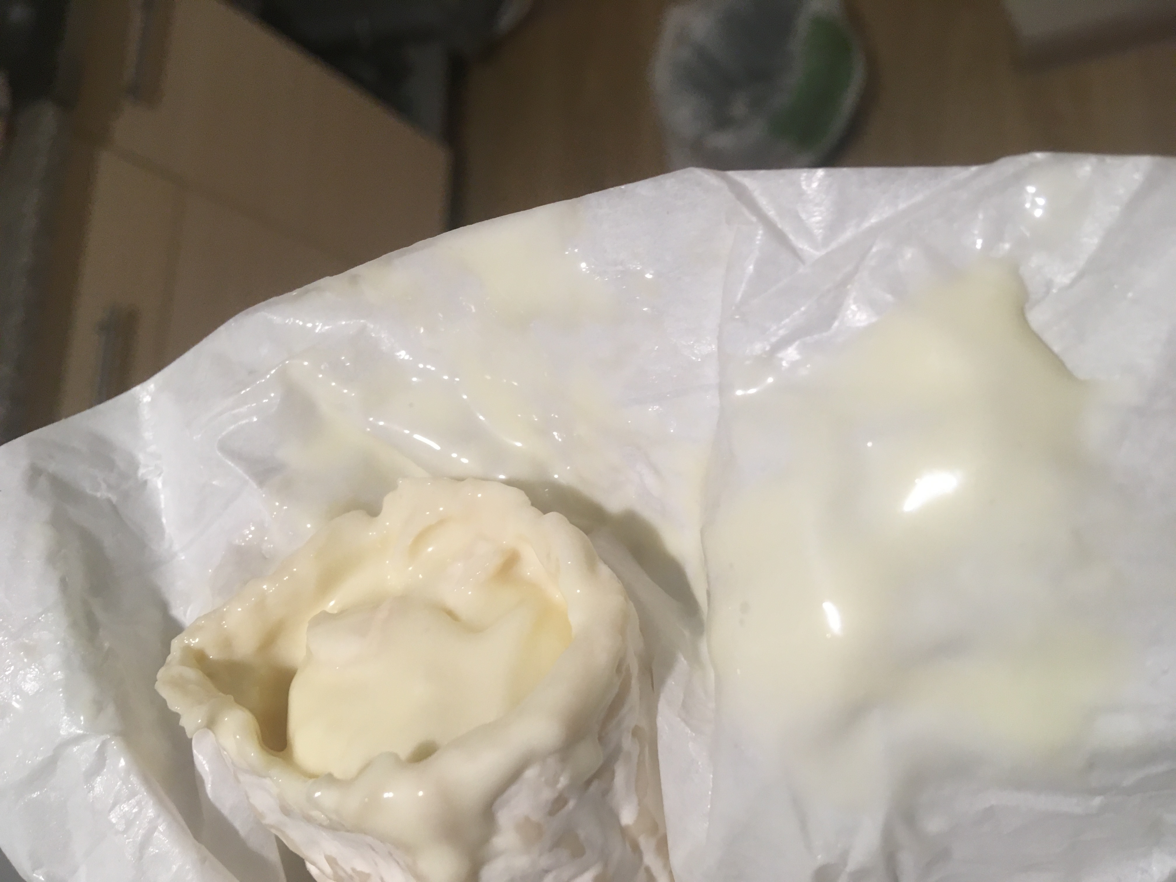 Здравствуйте. Я понимаю, что этот форум посвящён процессу приготовления сыра, но мне кажется, мне тут смогут подсказать. Купил вот такой вот сыр. Я уже раньше покупал такой же, но он был чуть другой, в серой упаковке. Он был мягкий, с плесенью, но при этом, весь продукт смотрелся монолитно, с одинаковой плотностью, как одно целое. Вот купил уже данный сыр, в зелёной упаковке, открыл и удивился. Вся упаковка изнутри измазана жидким сыром, вся внутренняя часть самого сыра отслоилась от внешней части сыра, и там в большей степени жидкий, как растаявшее сливочное масло. И сыр уже не представляет собой единую конструкцию, в отличие от предыдущего, Я начал сомневаться, с сыром все в порядке? Или его есть нельзя?