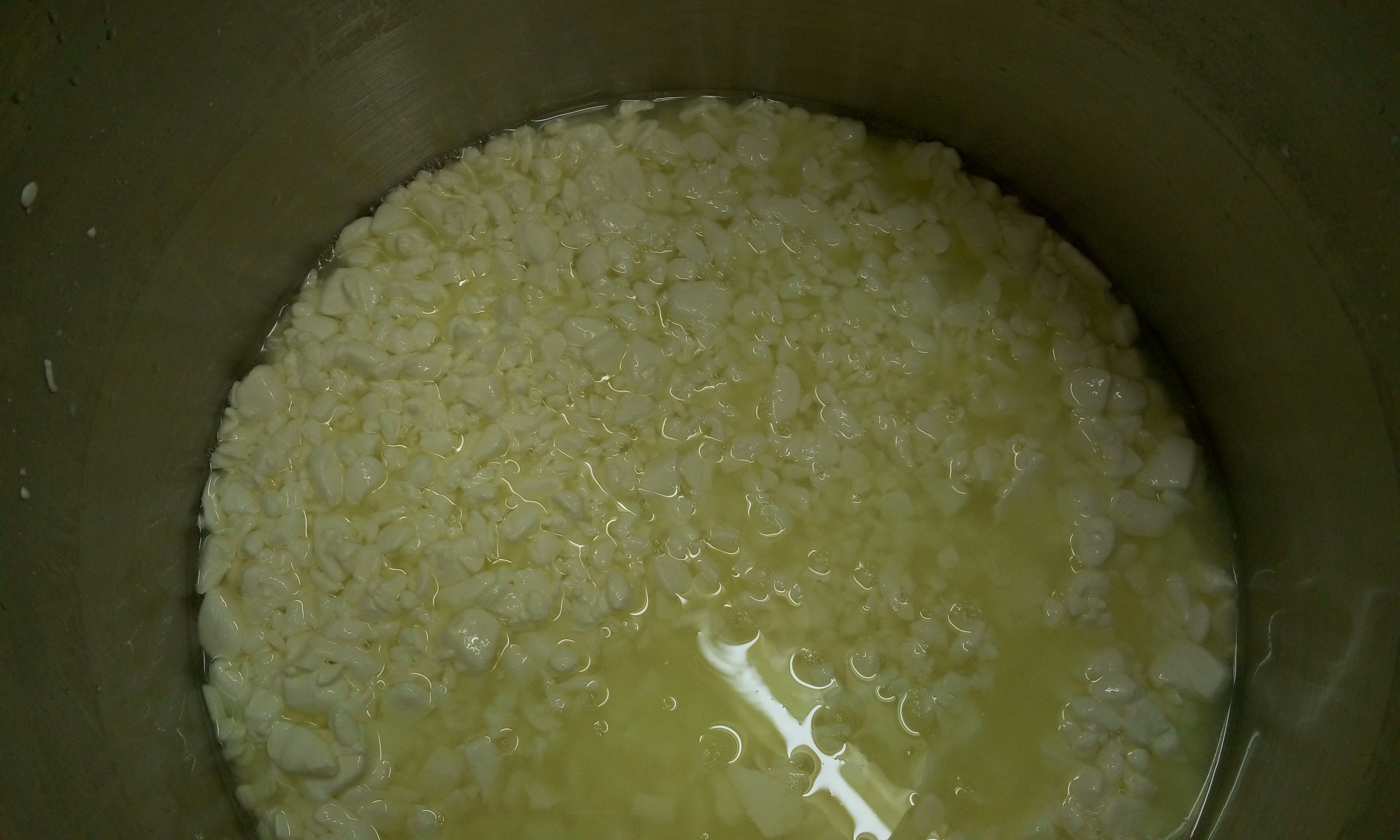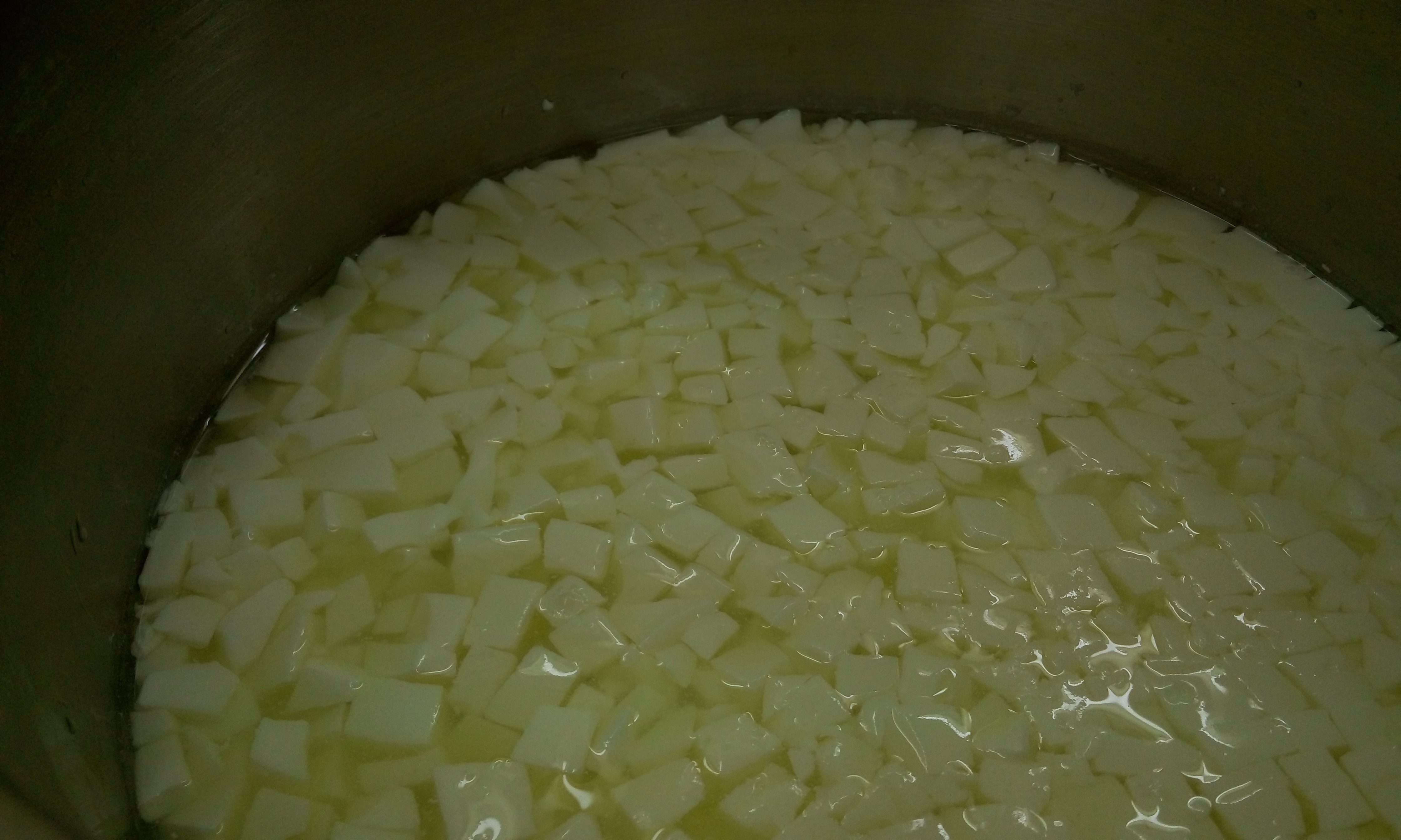 5. Время ожидания на этом этапе (до второй резки) составляется половину времени с момента внесения сычужного фермента до образования белковых хлопьев (у меня это было 10 минут). После этого была проведена резка сгустка в течение 8ми минут (резка производилась обычным длинных кухонным ножом, предварительно обработанным спиртом).