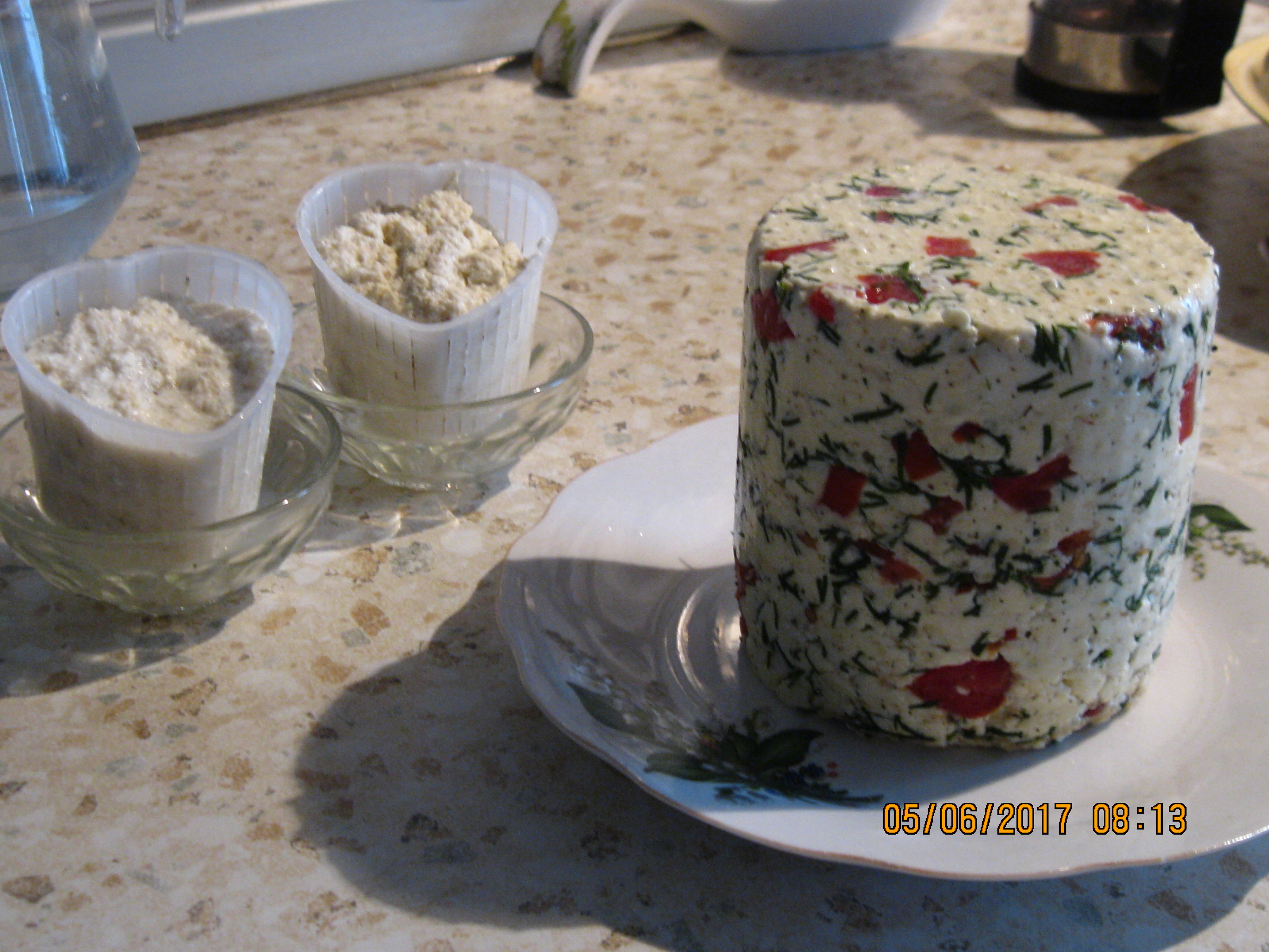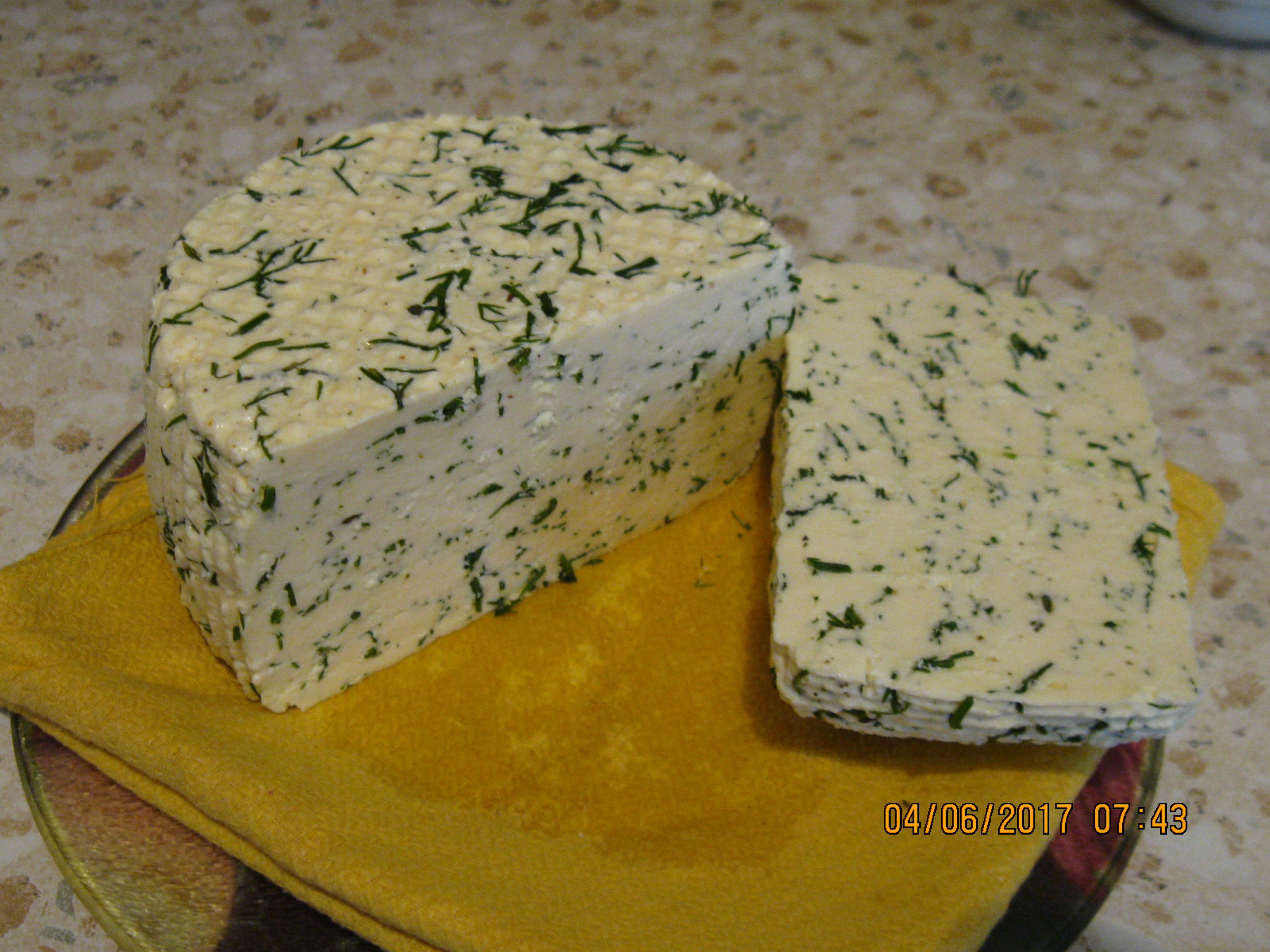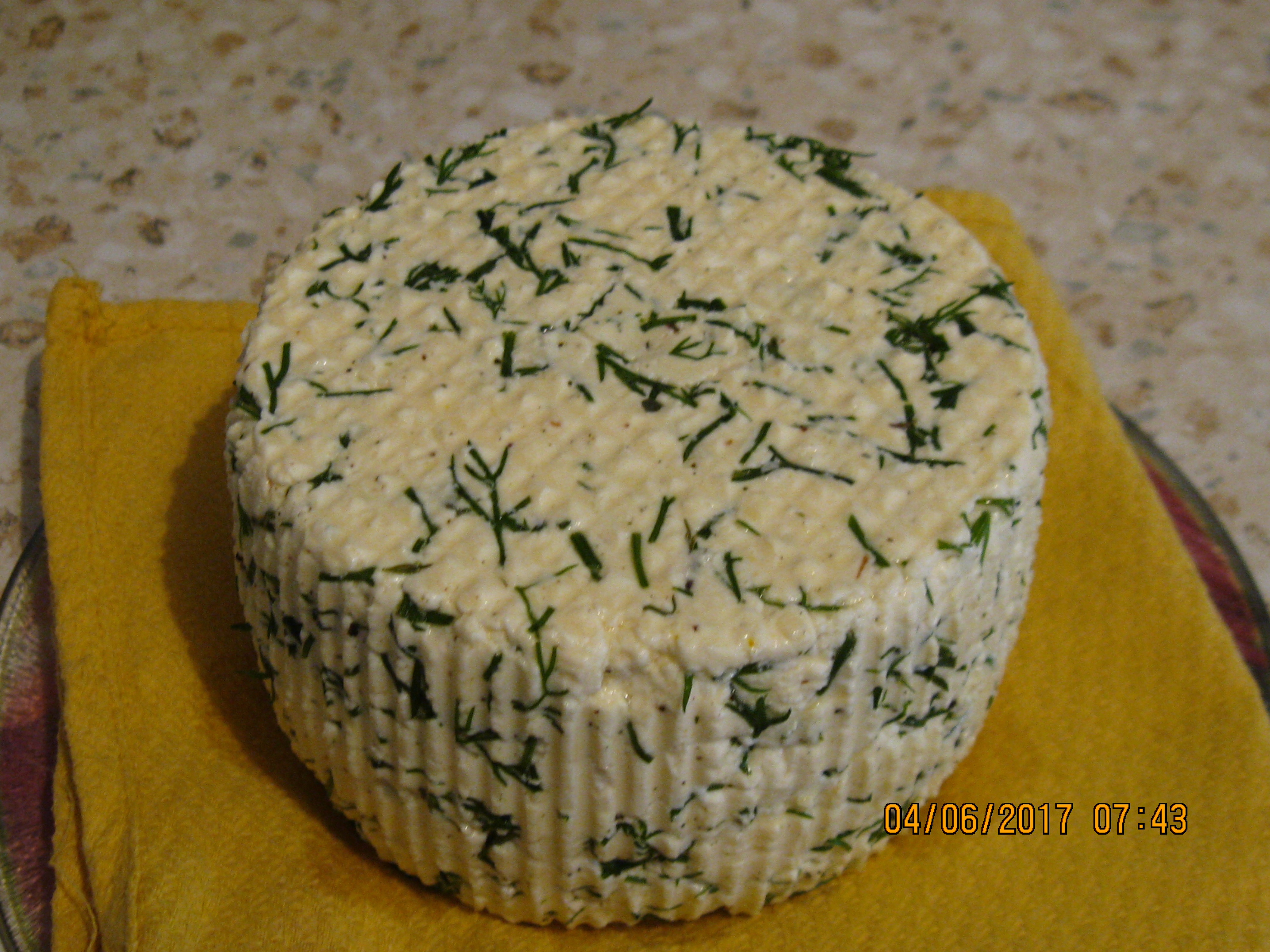 Здравствуйте всем! Это мой первый Домашний Сыр. Выход : из 3.8 л. молока - 800 гр.+ 3 сердечка рикотты. Не ожидала, что вкус домашнего сыра такой сливочный! Даже укроп не перебивает этот вкус! Солила в зерне адыгейской солью, хорошо приправленной черным перцем.