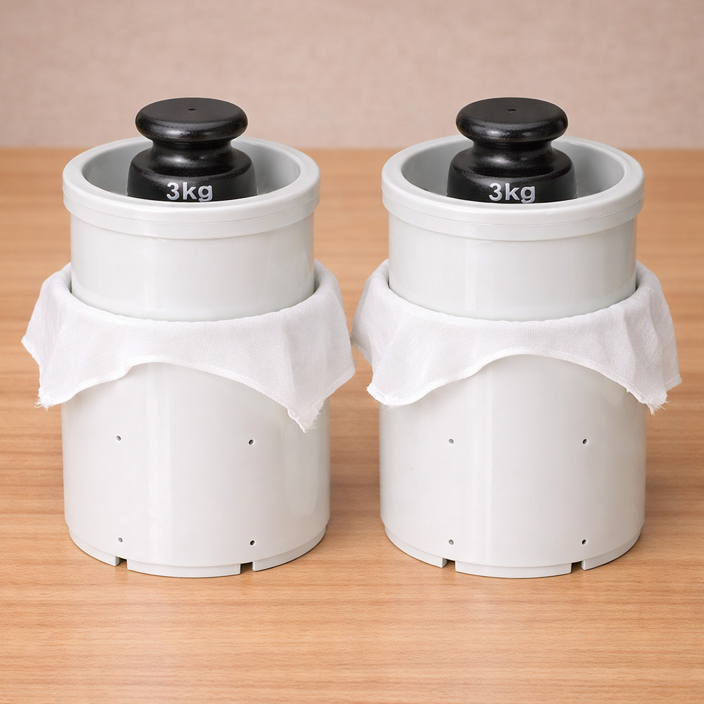 Закройте крышки и поместите заполненные формы под пресс. В качестве пресса можно использовать воду в бутылках. Постепенно тяжесть пресса будет увеличиваться. Начните с 3 кг. Через 20 мин необходимо перевернуть сырную головку, слить лишнюю сыворотку, добавить вес (до 7 кг) и оставить на 30 мин. Повторите процедуру и увеличьте вес до 11 кг., оставьте на 6-8 часов. При желании время можно увеличить до 12 часов. Это обеспечит более твердую консистенцию готового сыра.