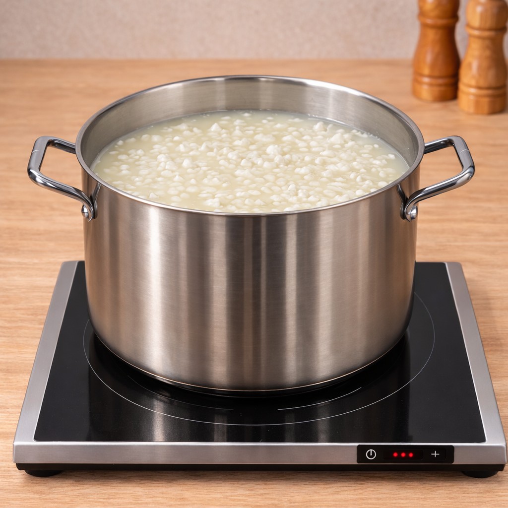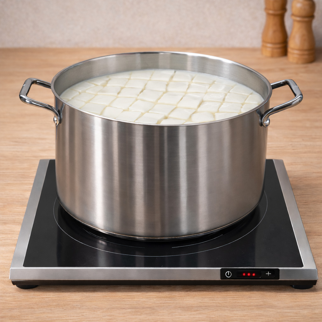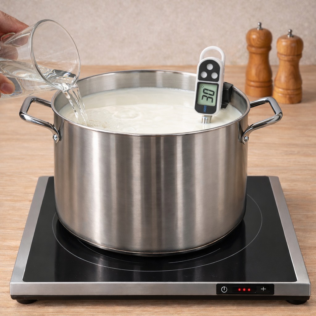 После нагревания молока до нужной температуры добавьте в него активированную закваску. Оставьте созревать на 30 минут, поддерживая при этом температуру 30°С.