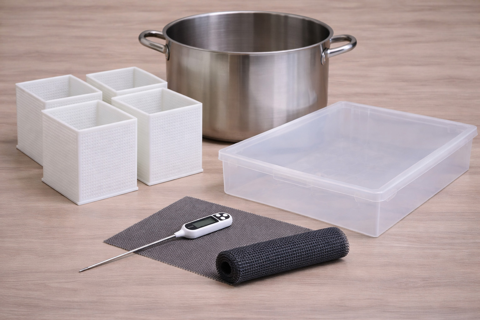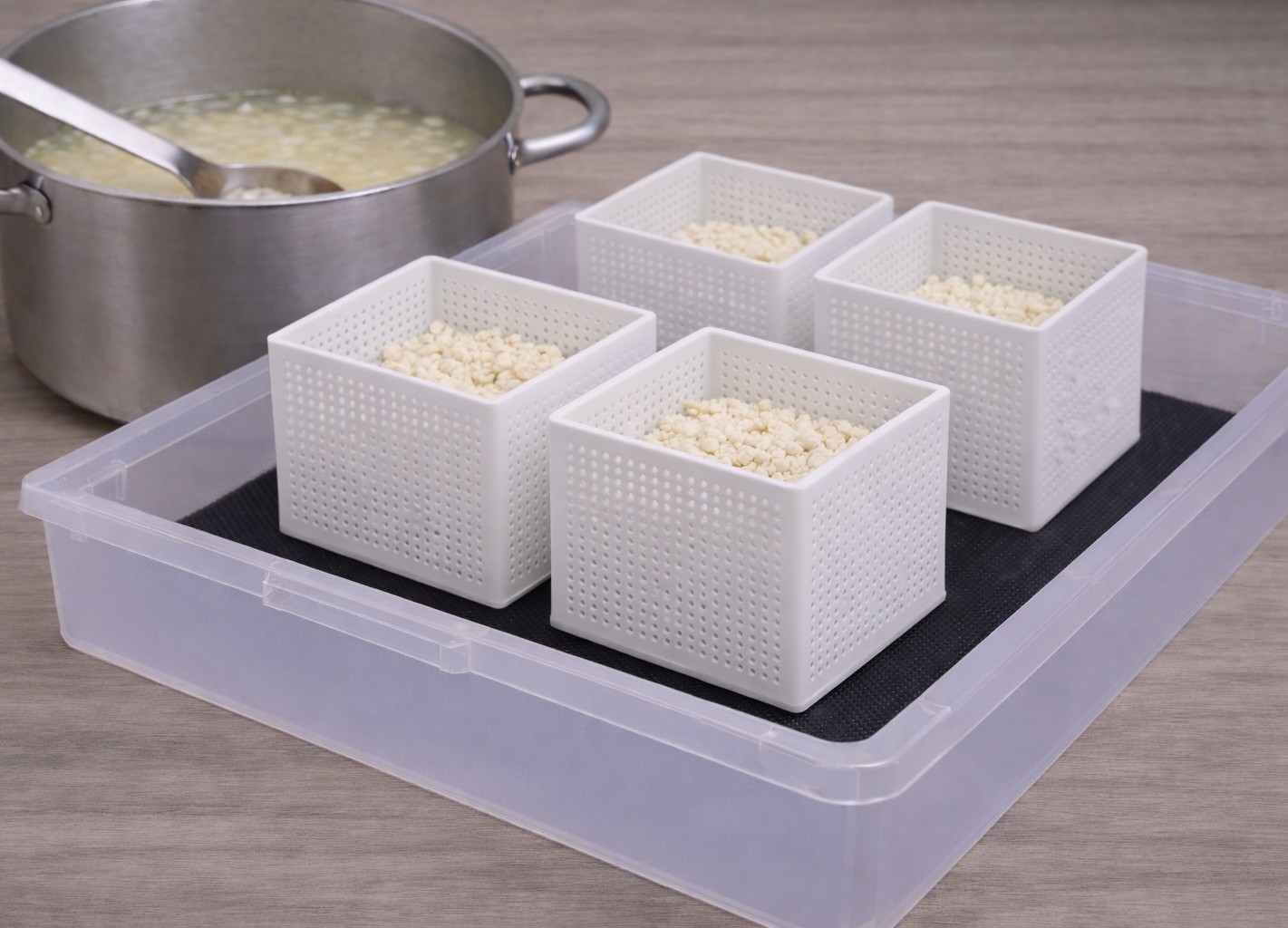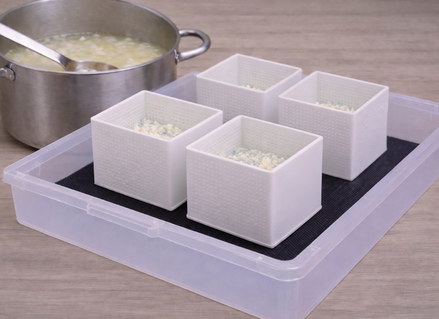 Пока происходит свертывание молока, Вы можете заняться дезинфекцией форм и дренажных ковриков. Дезинфекцию можно осуществить, погрузив оборудование в горячую воду на несколько минут.