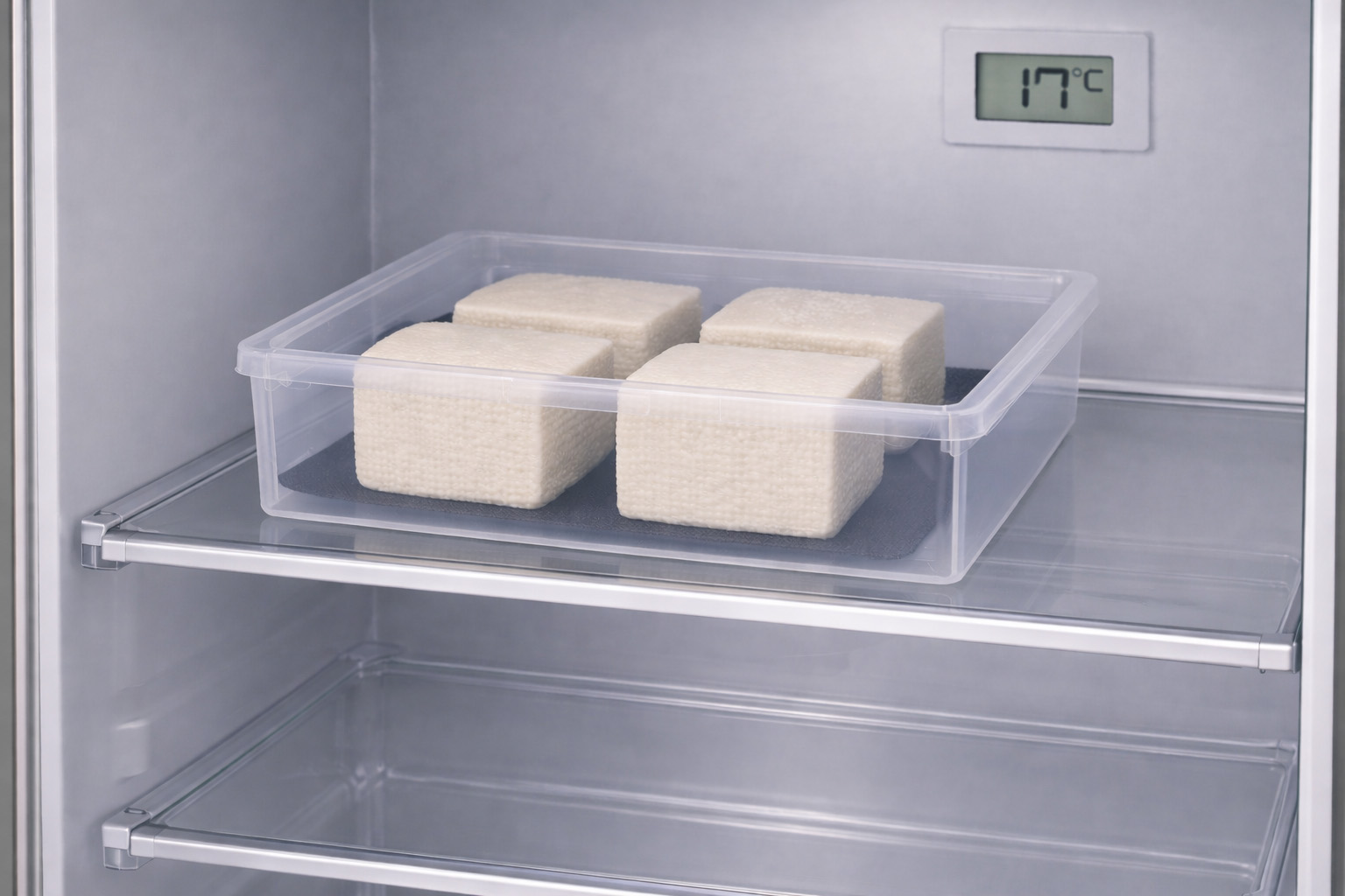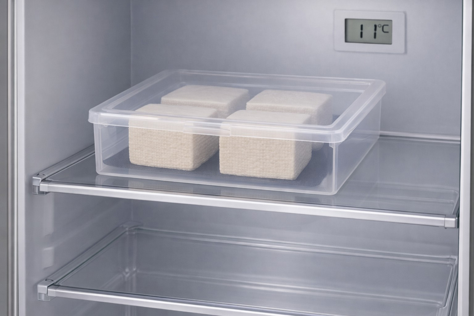 - После того, как поверхность сыра высушена (примерно через 1-2 дня) пришло время перейти на этап выдержки. Условия выдержки Камблю: температура 11-13°C и влажность 92-95%. Сыр необходимо переворачивать 1-2 раза в день. Для поддержания такого уровня влажности можно использовать пластиковые контейнеры с крышками и дренажными ковриками.