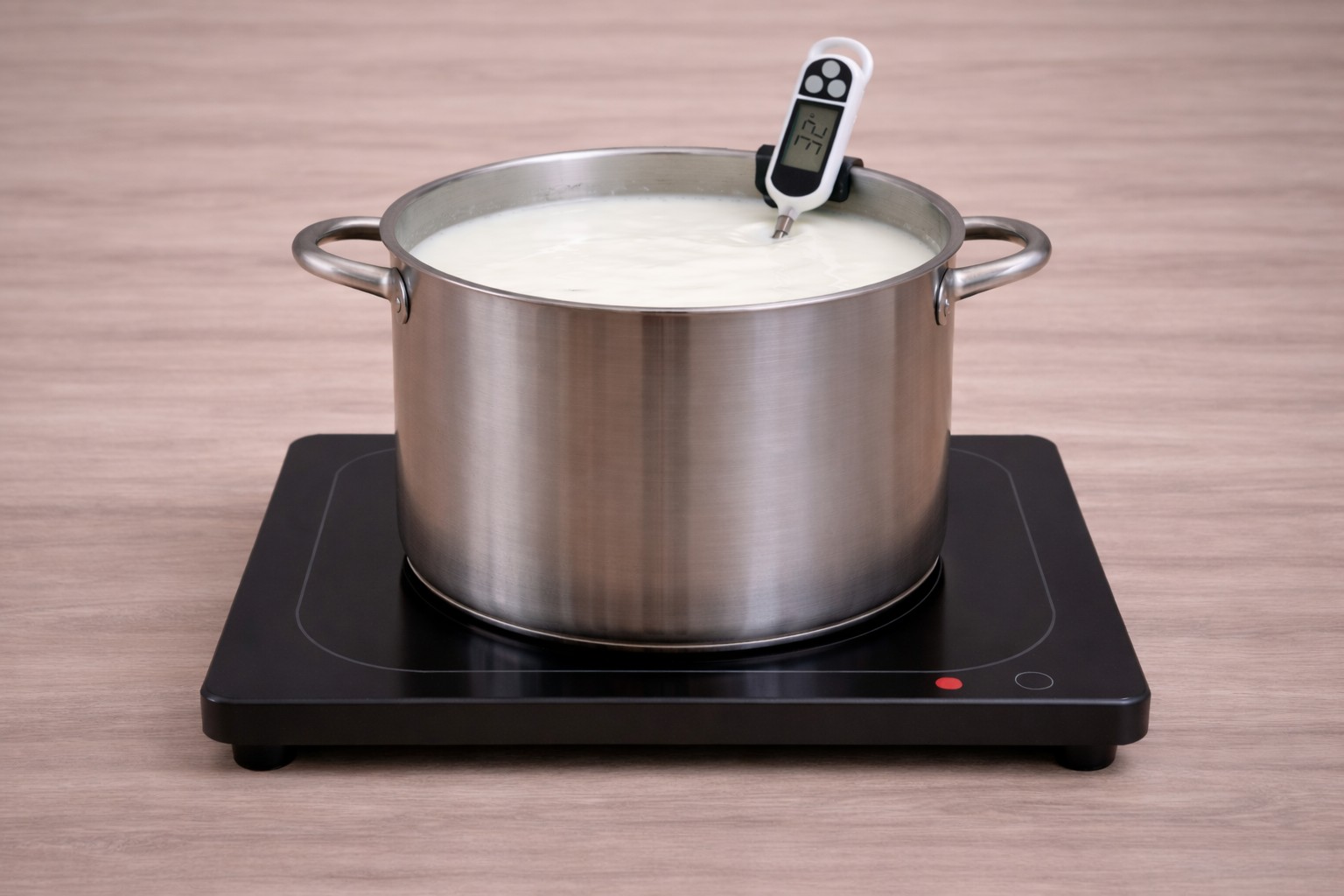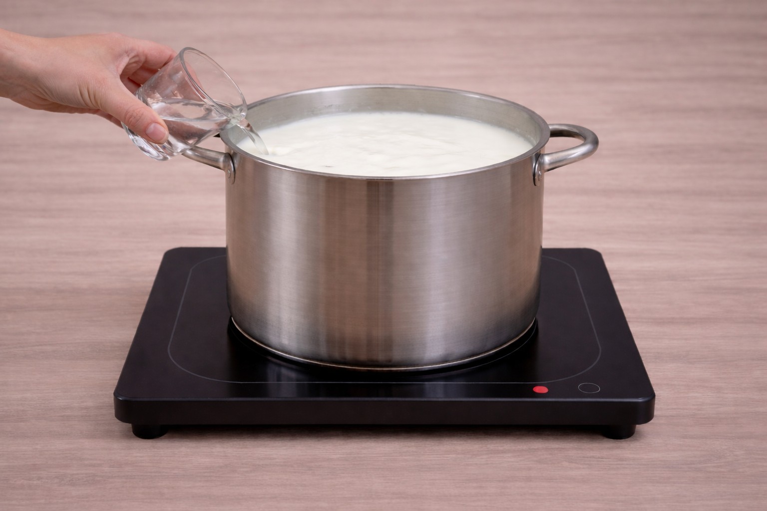 - Нагрейте молоко до температуры 32°C. Стоит помнить, что молоко в процессе нагревания нужно постоянно помешивать для того, чтобы обеспечить медленный и равномерный нагрев. Желательно производить нагрев на водяной бане, поставив кастрюлю с молоком в другую кастрюлю или в раковину с водой 36-38°C. Если вы греете молоко на открытом огне - следите за процессом нагрева и непрерывно помешивайте, чтобы молоко не пригорело. Пригоревшее молоко с запахом вряд ли улучшит вкус сыра.