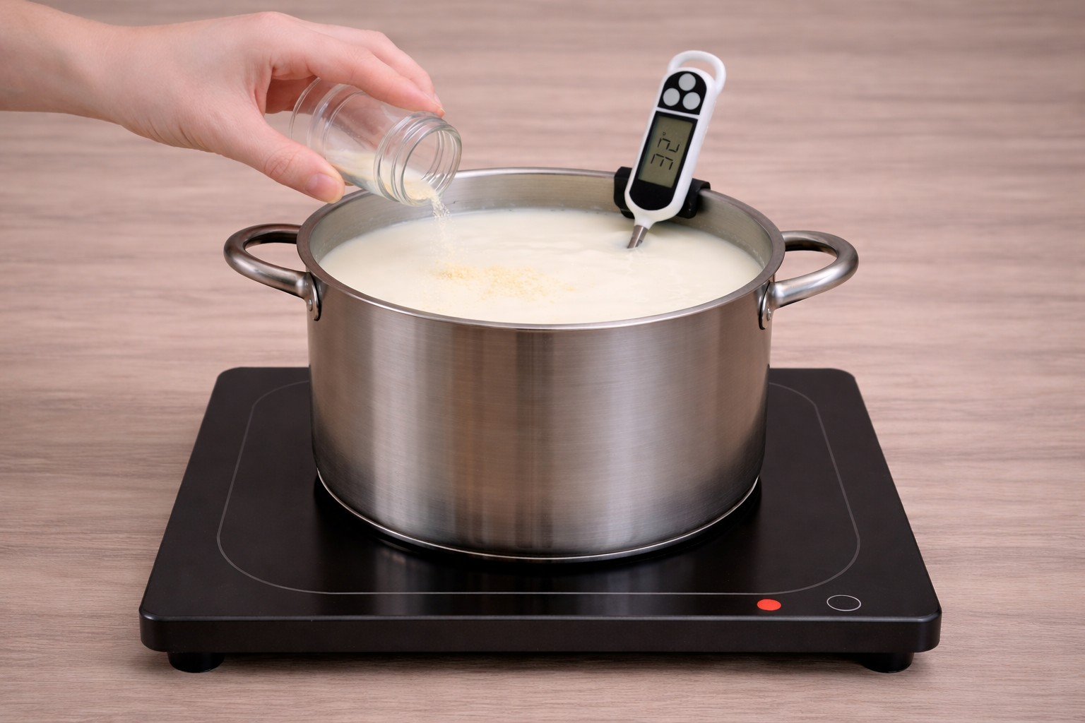 - Как только молоко достигло нужной температуры, добавьте закваску. Для этого высыпьте закваску на поверхность молока и оставьте на 2 минуты, только потом перемешайте. Такой способ внесения закваски предотвращает появления комочков закваски. На этой стадии плесени не добавляются!!!