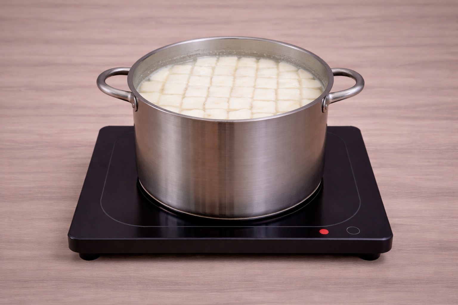 - После этого добавьте в молоко сычужного фермента, предварительно смешав его со 100 мл. теплой воды. Процесс свертывания начнется уже через 15-20 мин. Однако не торопитесь, коагуляция полностью завершается не менее, чем через 90 минут после внесения фермента.Обратите внимание, что для этого сыра мы берем половину привычной дозы сычужного фермента, в том числе и указанной на самом ферменте. Это не ошибка. Дело в том, что сгусток для Камблю должен образовываться в течение 90 минут. На протяжении этого времени ни в коем случае не трогайте сгусток и не перемешивайте молоко. Даже если первичная коагуляция пройдет, как обычно, в течение 15-20 минут, для образования крепкого сгустка при таком количестве фермента нам понадобится не менее полутора часов. Ничего страшного, если температура молока немного снизится в процессе коагуляции. Потом можно будет нагреть калье в процессе вымешивания.
