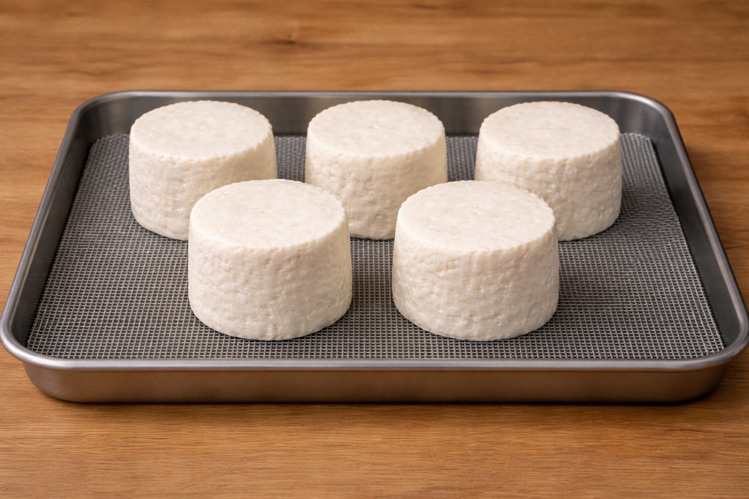 На дренажной сетке оставляем шевр на 24 часа при комнатной температуре для обсушки. В течение этого срока несколько раз переворачиваем, по необходимости меняем под дренажным ковриком салфетки. После отправляем сыр на дозревание в холодильник (температура 6-12 градусов). Вызревает шевр от одних суток до 3-4 недель. Один раз в день необходимо переворачивать сыр. Если шевр будет вызревать более 7 дней, тогда положите его в контейнер, на дно которого расстелите дренажную сетку.