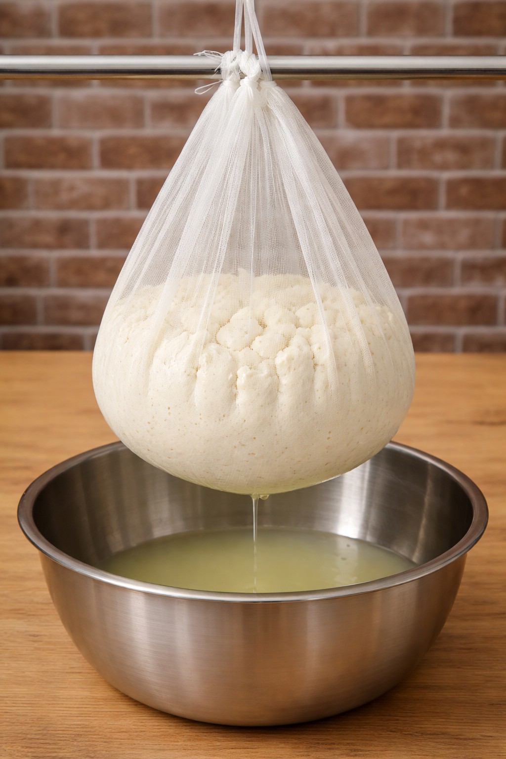 Теперь выкладываем массу в дренажный мешок и оставляем на 5-12 часов для стекания сыворотки. Температура в помещении не должна превышать 25°С. В итоге сырное зерно приобретет такую плотность, что из него можно слепить любую геометрическую фигуру и масса не будет распадаться.