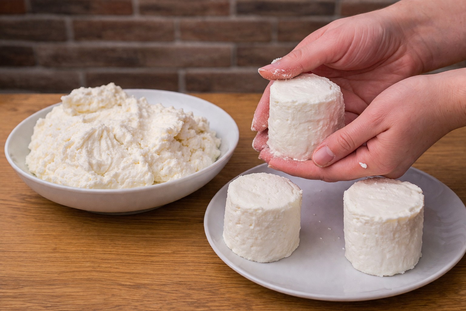 Теперь разделяем массу на одинаковые кусочки и скатываем плотные цилиндрики, диаметром от двух до четырех см. Длина такой «формы» не должна превышать 10-ти см. Если вы хотите получить более плотный цилиндр, можете воспользоваться бамбуковым ковриком (как для формирования роллов). После разложите цилиндрические головки сыра на дренажной сетке.