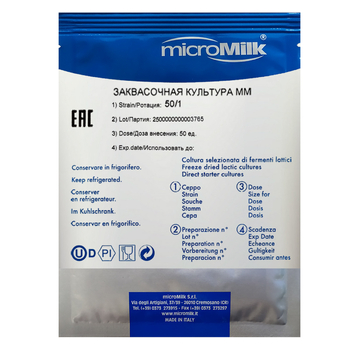 Мезофильная закваска  MicroMilk ММ50 подходит для производства творога как кислотным, так и кислотно-сычужным способом, а также для сыров российской группы с низкой температурой второго нагревания.